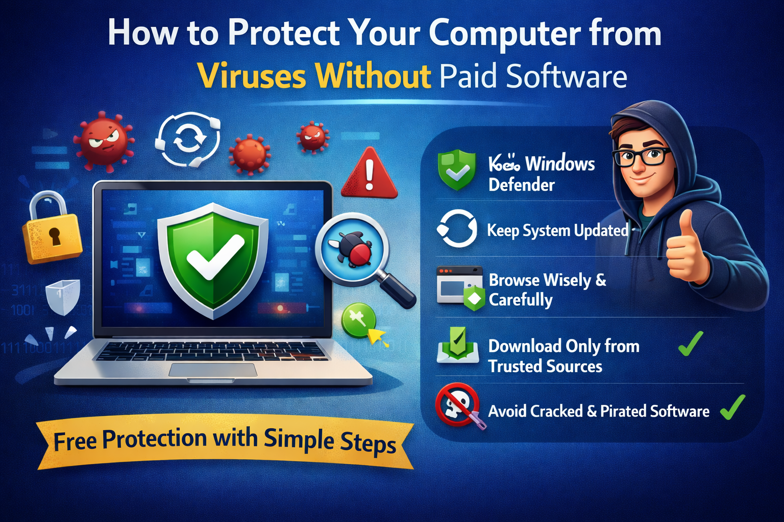 حماية جهازك لا تعتمد على المال، بل على الوعي. سلوكك اليومي هو العامل الأهم في منع الفيروسات. بالتحديث المنتظم، والحذر أثناء التصفح، واستعمال الأدوات المجانية المدمجة، يمكنك الحصول على مستوى حماية ممتاز دون أي تكلفة.